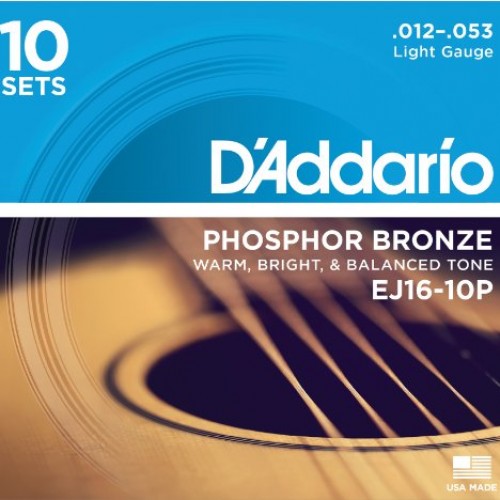D’Addario EJ16-10P Phosphor Bronze Light Gauge Acoustic Guitar Strings, Ten Pack