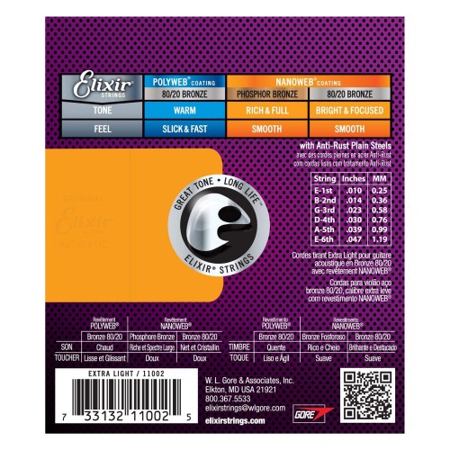 Elixir 11002 80/20 Bronze Nanoweb Extra Light 6-String Acoustic Guitar Strings