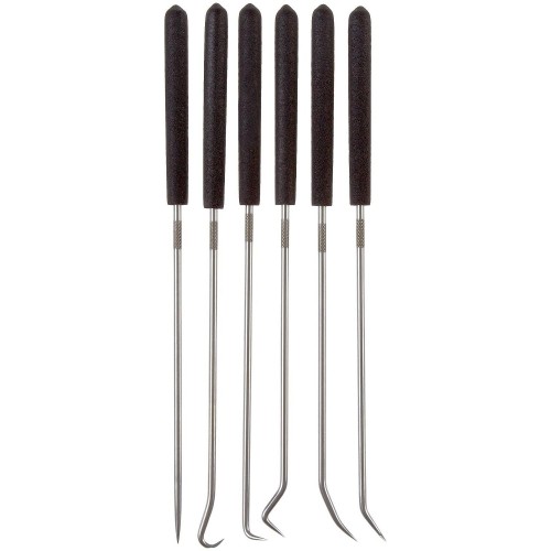 Each hook and pick is made of high carbon polished heat-treated steel. Cushion grip will not slip in wet or oily hands. Ideal for separating wires, removing small fuses, ”O” rings, retrieving washers and loose parts too small to pick up with your fingers. Available as a set or individually. Threaded replacement picks are available.