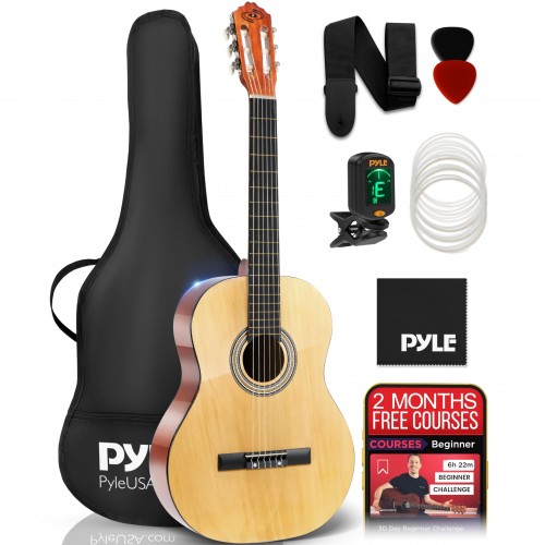Perfect for beginners This full size acoustic guitar arrives ready-to-play, right out of the box This complete kit includes 41-inch guitar, nylon storage bag, shoulder strap, digital tuner, an extra set of 6 steel strings, 3 picks (of assorted colors), and an instructional sheet The traditional, classic body style is great for students and teens learning to play guitar Designed with high-quality tonewoods, the top, back, and sides are crafted from linden for versatility and warmth with a high-gloss finish for a polished and professional look This acoustic guitar is ideal for beginners Featuring (20) finished frets, (6) pre-installed steel strings, easy-to-use tuners, and a comfortable neck Note, the guitar will arrive out-of-tune because the installed strings are new This is normal After the guitar has been played for a few weeks, the strings will begin to stretch and will require less tuning while playing Dimensions: Overall: 41 Long x 16 Wide x 325 Deep Size: 41 Scale Length: 255 Neck Length (nut to body): 14 Body Length: 20