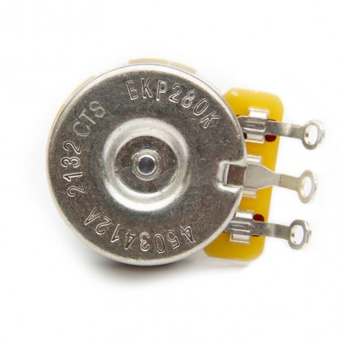 Our Bare Knuckle Custom Audio Taper 280K CTS standard shaft potentiometers. These pots feature a smooth torque and +/- 10% tolerance and are specially made for Bare Knuckle by CTS. These custom CTS280K pots are best used in Strats® and Teles®.Circlip fitted to shaft for increased durability.