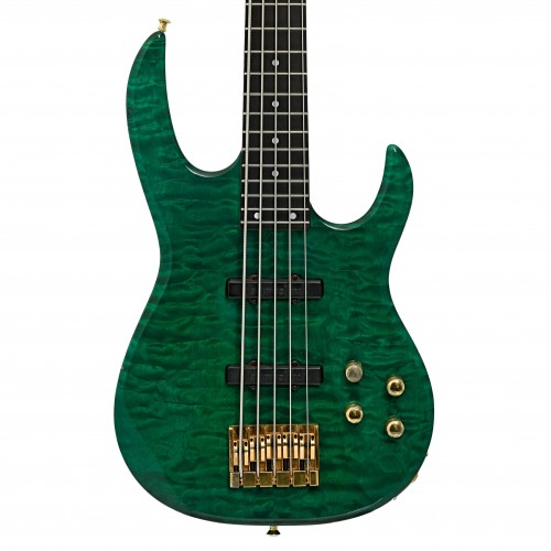 Exotic looks and a big sound define this Carvin LB75. It features a transparent emerald green finish over a quilt maple top, maple neck-through construction, and maple body wings. The 2-octave ebony fretboard has dot markers, and it’s equipped with Bartolini J bass pickups and active electronics. Comes with the original tweed case.