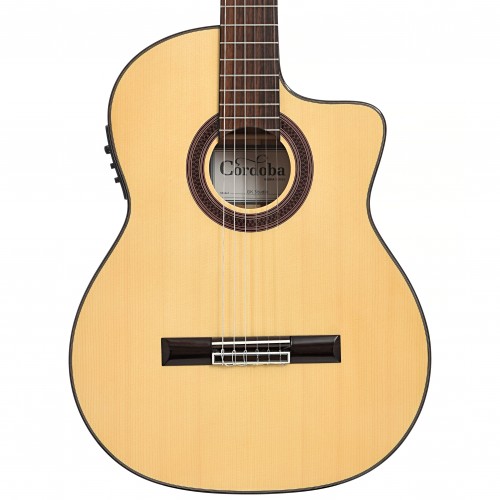 This Cordoba GK Studio is a nice entry level nylon-string guitar with cutaway. Features include solid spruce top, Cypress back and sides, mahogany neck, rosewood fingerboard and bridge. Equipped with factory Fishman pickup / microphone system. Gigbag. Import.