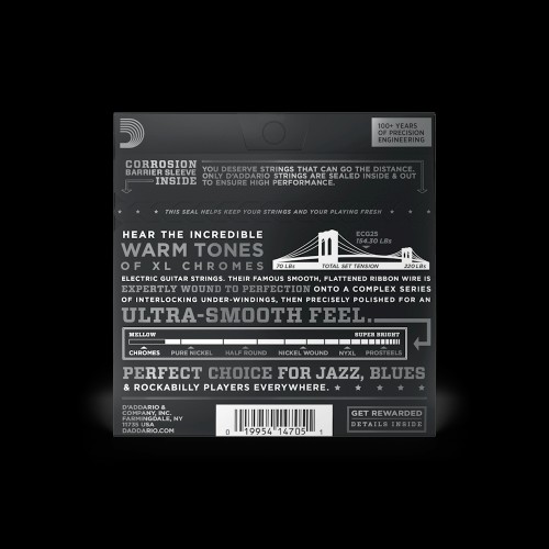 ECG25 is a popular flat wound set with smooth feel, warm/mellow tone and tighter tension XL Chromes are noted for their smooth feel and warm, mellow tone, essential to the sound and style of many jazz, blues, and rock players.