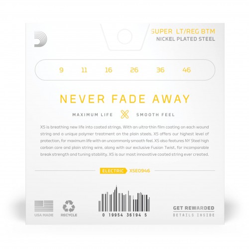 XS Nickel coated electric guitar strings provide the longest life of any DAAddario electric guitar string coated with our groundbreaking XS coating, these premium electric strings attain maximum life and a smooth, fast feel without dampening their outstanding tone constructed with a NY Steel core, reformulated nickel-plated steel wrap wire, and Fusion Twist technology, XS Nickel strings boast superior strength and tuning stability, plus richer harmonics, greater clarity, and remarkable definition with every sweep, slide, and bend This 09-46 Super Light TopReg Bottom gauge set has more low-end tone than Super Light, while staying flexible for bends