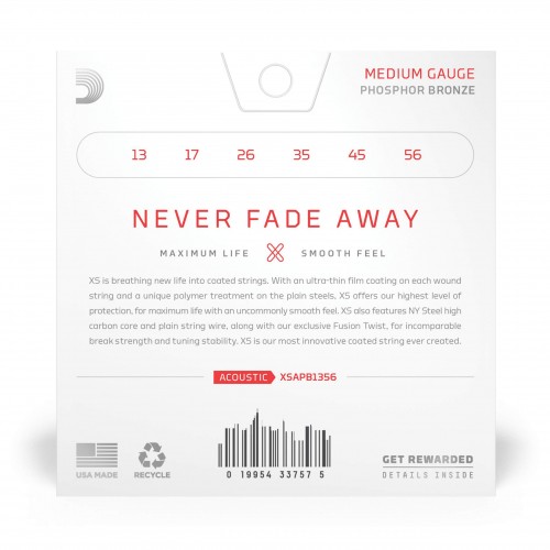 Born from our greatest breakthrough in string innovation, XS Phosphor Bronze strings have the longest life of any DAAddario acoustic guitar string The XS coating gives our warm, balanced phosphor bronze strings maximum life, with an uncommonly smooth feel Made with a NY Steel core, phosphor bronze wrap wire, and Fusion Twist technology, XS coated acoustic guitar strings have incomparable break strength and tuning stability, in addition to their dramatically increased lifespan This 13-56 Medium gauge set provides maximum volume and projection, with more tension and resistance