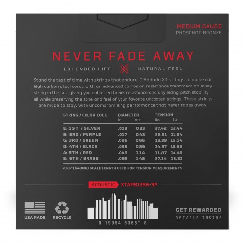 D’Addario Guitar Strings – XT Phosphor Bronze Coated Acoustic Guitar Strings – XTAPB1356-3P – Extended String Life with Natural