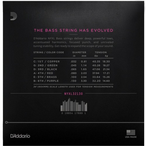 | D’Addario’s NYXL electric bass string sets feature the innovative combination of NYXL nickel-plated wrap wire wound on our NY Steel core for expanded dynamic range and harmonic response. NYXL32130 provides 6-string players with an extremely versatile string set, including a deep, tight, low B-string, and crisp High C string. |