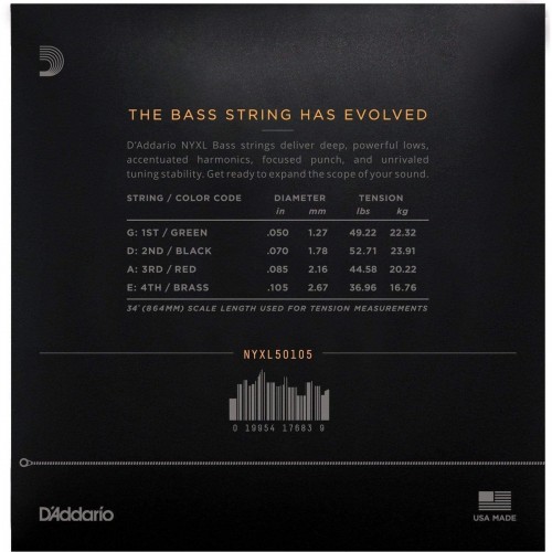 | D’Addario’s NYXL electric bass string sets feature the innovative combination of NYXL nickel-plated wrap wire wound on our NY Steel core for expanded dynamic range and harmonic response. NYXL50105 is our heaviest NYXL string set and provides players with a strong overall fundamental and maximum tone. |