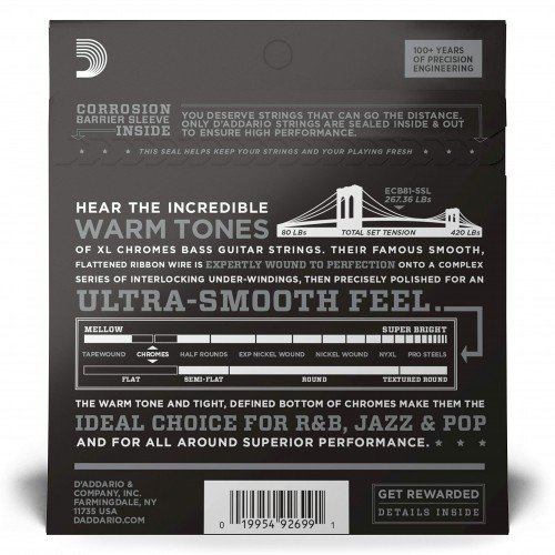 Product DescriptionXL Chromes are among the warmest, mellowest bass strings we have to offer. These flat wound strings provide an ultra-smooth feel and a dark, yet warm tone, while allowing movement across the fretboard with no finger noise. Made with a high carbon steel core, Chromes stainless steel flattened ribbon wrap wire is expertly wound onto a series of interlocking under-windings, then precisely polished for unparalleled smoothness and a tonal presence which blends beautifully into the mix. Made for 5-string basses, 45-132 Regular Light Super Long Scale strings provide players with a versatile, super long scale option, in our most popular string gauge.From the ManufacturerECB81-5SL, the 5-string super long version of D’Addario’s best-selling Flatwound bass strings, are known for their warm, mellow tone and smooth polished feel. With the addition of a .132 low B, ECB81-5SL Chromes deliver a deep, rich low bottom end which makes them the flat wound choice of Jazz, R&B and Pop musicians. Fits super long scale basses with a string scale length of up to 38 inches.D’Addario Chromes Bass strings are wound with flattened stainless steel ribbon wire which is polished to an incredibly smooth surface. Delivering a distinctive damped, but tone-rich sound that only flatwounds can produce, D’Addario Chromes are the world’s most popular flatwound strings.D’Addario, the world’s largest manufacturer of musical instrument strings, is known as The Players Choice with a reputation for unsurpassed quality and consistency. D’Addario’s innovative, packaging reduces waste and provides protection from corrosion. All D’Addario strings are manufactured in the U.S.A. using proprietary, digitally controlled, state-of-the-art machinery for unmatched performance, set after set.