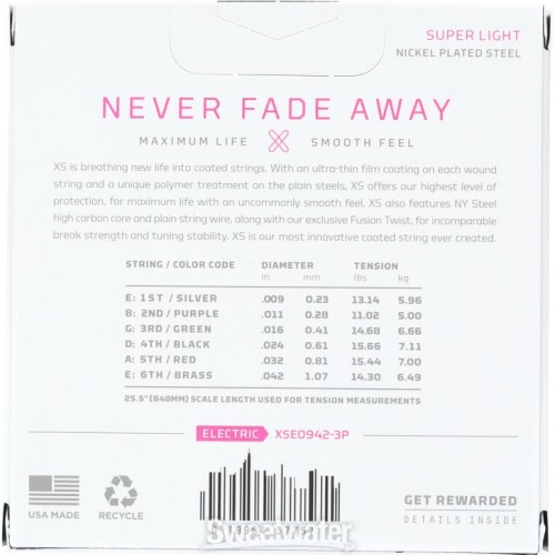 XS is breathing new life into coated strings. With its ultra-thin film coating on every wound string and unique polymer treatment on the plain steels, XS offers our highest level of protection for maximum life with an uncommonly smooth feel. XS also features NY Steel high carbon core and plain string wire, along with our exclusive Fusion Twist, for incomparable break strength and tuning stability. XS is the most innovative coated string ever created.