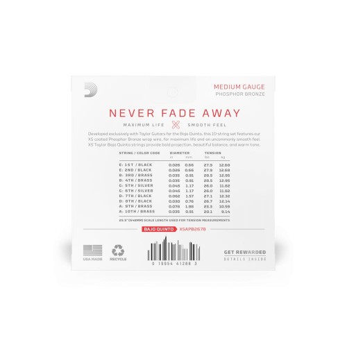 Born from our greatest breakthrough in string innovation, XS Phosphor Bronze strings have the longest life of any D’Addario acoustic guitar string. The XS coating gives our warm, balanced phosphor bronze strings maximum life, with an uncommonly smooth feel. Made with a NY Steel core, phosphor bronze wrap wire and Fusion Twist technology, XS coated acoustic guitar strings have incomparable break strength and tuning stability, in addition to their dramatically increased lifespan. This 26-78 Bajo Quinto set is made specifically for the Taylor Bajo Quinto and will also fit other similarly-sized instruments.