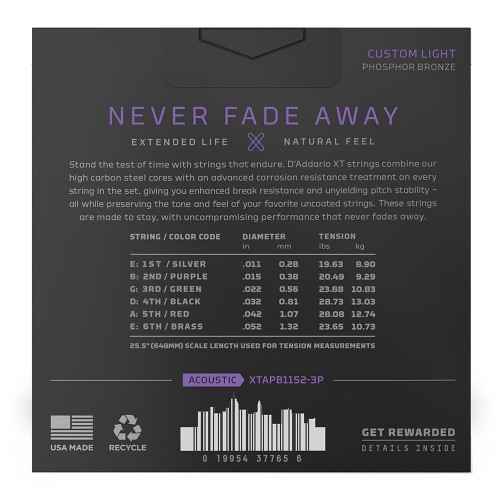 Get the warm, balanced tone you love with D’Addario XT Acoustic Phosphor Bronze strings. These strings offer enhanced break resistance, pitch stability, and longer life. The advanced corrosion resistance of the coating and the NY Steel core provide added resilience, making them perfect for a variety of acoustic styles.