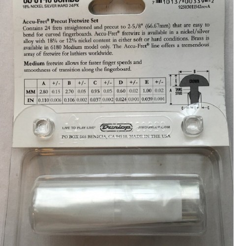 Dunlop Accu-Fret fretwire is manufactured from a durable nickel/silver alloy and delivers a warm and clear tone-the preferred brand for guitar builders and repairmen worldwide. These are Medium 18% Nickel Silver wires precut to 2 5/8 inches (66.67mm). Medium fretwires allow for faster fingerspeeds and smoothness of transition along the fingerboard.