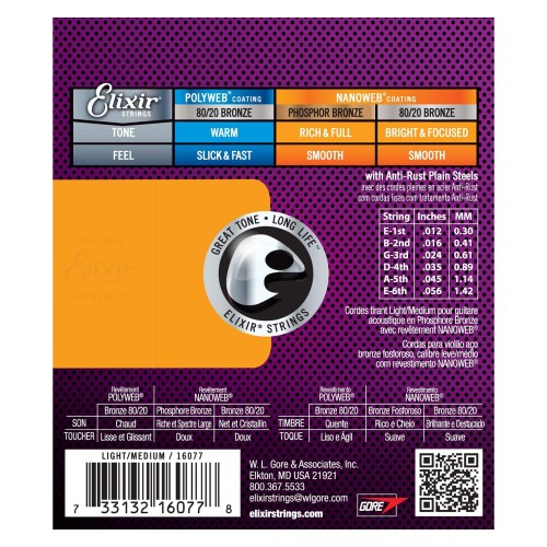 Elixir 16077 Phosphor Bronze With Nanoweb Coating Acoustic Guitar Strings – Light/Medium .012-.056
