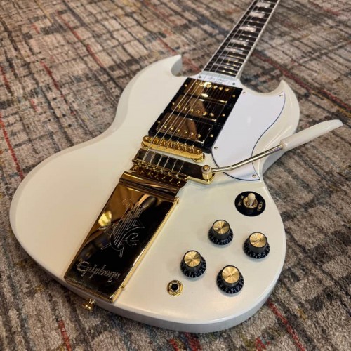 Made in collaboration with Gibson Custom, the Epiphone 1963 Les Paul SG With Maestro Vibrola is a stunning recreation of the classic vintage model. 1963 was the last year that the “Les Paul” moniker was used on the SG Custom and the first year for the Maestro Vibrola. The premium appointments the model is known and loved for are all present here, including a one-piece mahogany neck with a long neck tenon, a SlimTaper profile, and a bound ebony fretboard. It also features mother-of-pearl block fretboard inlays and a Custom split diamond headstock inlay on the bound Gibson-style “open book” headstock. The electronics are equally impressive, with three USA Gibson Custombucker humbucking pickups hand-wired to CTS potentiometers, Mallory capacitors, and a Switchcraft pickup selector toggle switch and output jack. The VOS (Vintage Original Sheen) Classic White finish is nicely complimented by the gold hardware, including 18:1 ratio Grover Rotomatic tuners. A black hardshell case with Inspired by Gibson Custom graphics and a goldenrod interior is also included.
