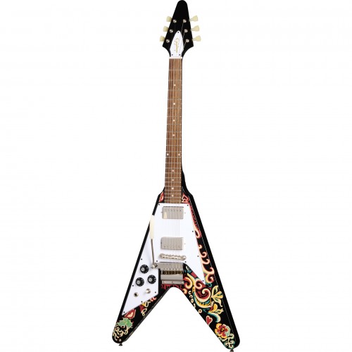 Jimi Hendrix™ is widely regarded as the most innovative guitarist of the rock era, a player who took the instrument to places no one else had ever gone before. Now, Epiphone, in partnership with Gibson Custom and the Hendrix family, is proud to introduce the Jimi Hendrix “Love Drops” Flying V™, an Inspired by Gibson Custom recreation of a guitar that Jimi played extensively from 1967-1969. Originally a Sunburst, Jimi Hendrix customized his Ebony-refinished Gibson™ Flying V with psychedelic graphics that he hand-painted, which are recreated here.