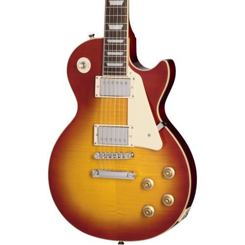 Epiphone’s Inspired by Gibson™ Collection proudly presents the Les Paul™ Standard 50s! This guitar lovingly recreates the feel and tone of the 1950s-era Les Pauls. Epiphone’s long friendship with Mr. Les Paul began in 1940 when Les built one of the world’s first solidbody electric guitars while working nights at the original Epiphone factory in Manhattan. Les’ first solidbody guitar, nicknamed “the Log,” would go on to inspire the Les Paul Standard, which many consider the greatest electric guitar ever made. This guitar is crafted with a mahogany body, maple cap with AAA flame maple veneer, bound ’59 Rounded Medium C-shaped mahogany neck with long neck tenon, laurel fretboard with classic trapezoid inlays, Epiphone’s Vintage Deluxe tuners, a pair of critically acclaimed Epiphone Probucker™ humbuckers™, and gold Top Hat knobs with dial pointers. This Epiphone Inspired by Gibson Original model also has the Kalamazoo headstock, Graph Tech® nut, era-appropriate wiring, and CTS® pots. A premium gig bag is also included.