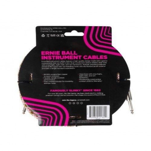 Ernie Ball instrument cables feature a high-quality design made with superior components that are built to last. Dual-conductors deliver reliably clear tone with crisp highs, tight mids, and rich harmonics. Multiple shielding materials preserve the signal with low handling noise, and the braided jacket exterior provides a tangle-resistant experience. Cable length 18ft (5.49m).