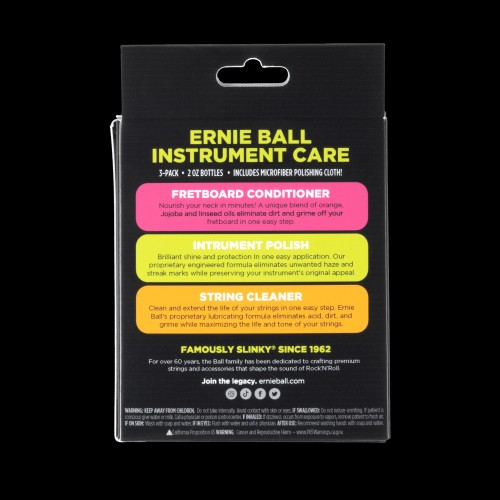 The Ernie Ball Instrument Care Kit has all the essential components for cleaning, maintaining, and enhancing the performance of your instrument. It includes a string cleaner that extends the lifespan of your strings and safeguards them from moisture and corrosion. The instrument polish removes grime, haze, and fingerprints, while the fretboard conditioner cleans and moisturizes your fretboard. The kit also includes a microfiber polishing cloth for effortless, no-mar application, ensuring your instrument always looks and sounds its best.