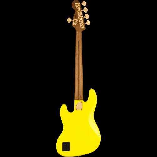 The MonoNeon Jazz Bass® V features an alder body finished in an eye-popping neon yellow urethane finish, complemented by a neon orange painted headstock and pickguard. The 22-fret one-piece roasted maple neck features a 10″-14″ compound radius fingerboard and elegant white pearl block inlays. Custom-wound Fireball® 5-string Bass Humbucking pickups deliver fat, punchy tone while the 18v active preamp with 3-band EQ provides flexible tone-shaping for any style of music. The Fender HiMass™ string-through/top-load bridge provides increased resonance and sustain, and the gold hardware adds to the distinctive look of this stunning bass. Also Included are a MonoNeon sticker pack and custom headstock sock. The MonoNeon Jazz Bass V makes a statement – equal parts swagger and serious business.