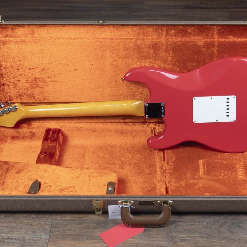 During the late ‘50s and early ‘60s, the popularity of Fender musical instruments flourished, and although the Fender assortment had expanded to include many great new instruments, the Stratocaster® reigned supreme. By 1961, the Stratocaster had taken on a more refined aesthetic, with a 3-Colour Sunburst reformulated with a more vibrant red and bolder black edge, topped with a 3-ply pickguard accenting the Strat’s signature curves.