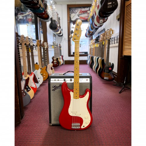 This Fender’s 80’s student model comes with a deep sound and an easy playing maple neck. Features include gloss red finish and string-thru bridge. Equipped with a split-coil pickup. Hard shell thermoplastic case. Made in USA. On consignment.