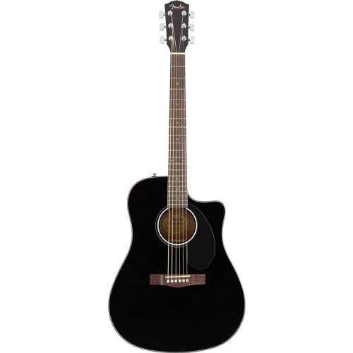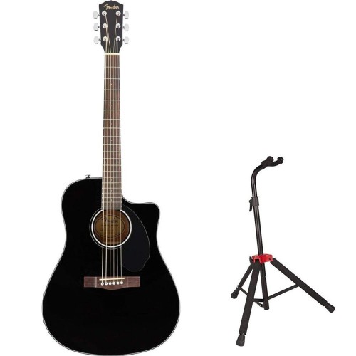 Fender CD-60SCE Dreadnought Cutaway Acoustic Electric Guitar- Black Bundle with Fender Guitar Stand, Height-Adjustable with Sturdy Metal