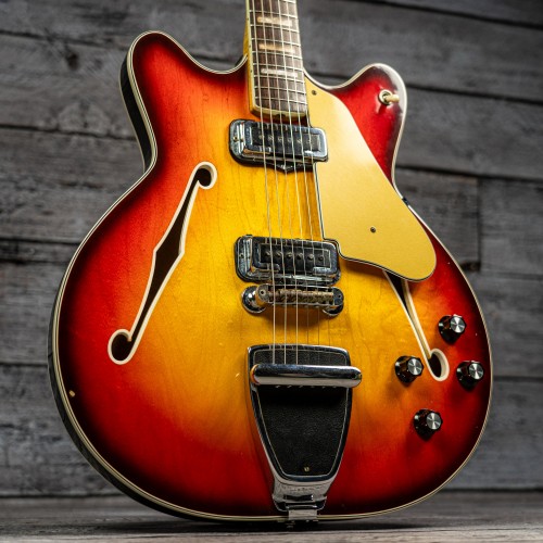 Funky Fender post-CBS era offering in 3-tone sunburst. Designed in response to the popular Gibson ES-330. Loaded with vibe and character. Fully hollow body design, fit with coveted DeArmond single-coil pickups.