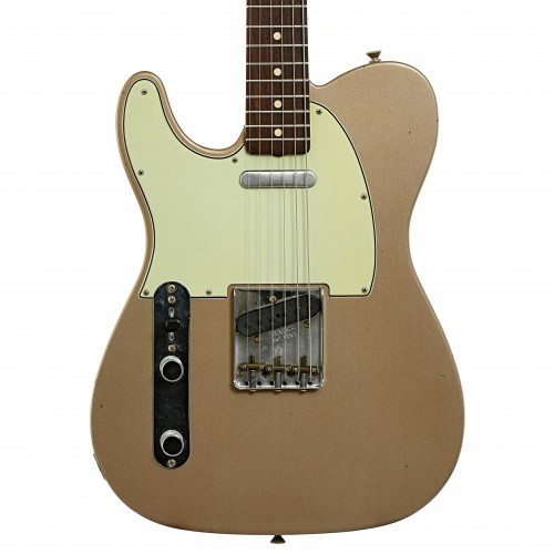 Lefties gotta twang! Love this Custom Shop Tele, featuring a Shoreline Gold lacquer finish on alder body, mint green pickguard, and a rosewood fingerboard on a maple neck. Equipped with dual factory Relic single-coil pickups, an ashtray bridge, and vintage-style tuners. Original Custom Shop hard shell case. Made in USA. On consignment.