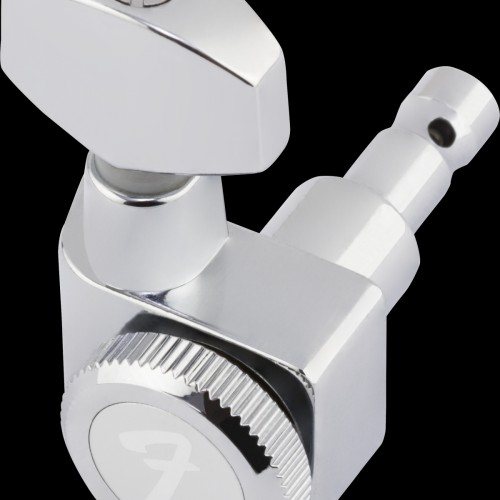 Set of six locking tuners designed to fit most modern-style Fender electric guitars with dual-pin mounting configuration. Tall post tuners are used for the wound strings and shorter post tuners are used for the plain strings. Staggered tuners increase the break angle over the nut and improve tuning stability.