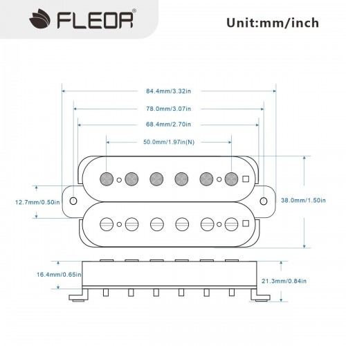 Specifications: Position: Neck Pickup. Magnet: Ceramic. Pole Pieces: 6 Non-Adjustable Slug Pole Pieces & 6 Adjustable Screws Pole Pieces. Pickup Pole Spacing: 50mm. Resistance: Total is 7-8k ohms, Single Coil Pickup is 3-4K ohms. Bobbin: ABS Bobbin, Black. Fully Wax Potted and Sealed to eliminate any unwanted feedback and noise. Package Included: 1 x Neck Humbucker Pickup 2 x Screws 2 x Springs
