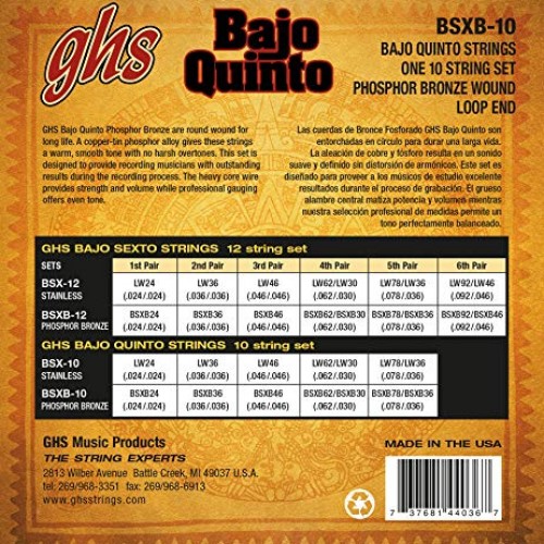 GHS Phosphor Bronze Bajo Quinto Strings. Made to provide long life and bright sound, GHS Bajo Quinto Stainless Steel strings offer Loop End with Lock Twist for the best possible tuning and tension. A heavy core wire provides strength and volume while our professional gauging gives you excellent tonal qualities.GHS Bajo Quinto Phosphor Bronze son bobinados redondos para una larga vida. Una aleaci n de f sforo de cobre y estao le da a estas cuerdas un tono c lido y suave sin matices speros. Este conjunto est diseado para proporcionar a los m sicos grabadores resultados excepcionales durante el proceso de grabaci n. El alambre de n cleo pesado proporciona fuerza y volumen, mientras que la medici n profesional ofrece un tono uniforme.
