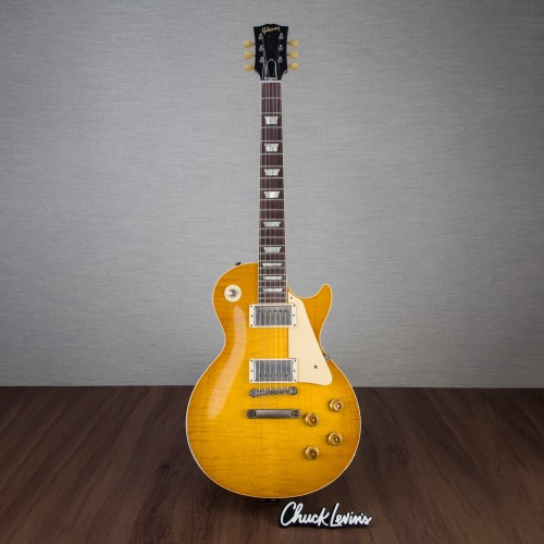 Gibson Custom Shop’s 1959 Les Paul™ Standard Reissue is not just a tribute to the priceless original models — it’s a clone of them. From laser-scanned dimensions to chemically-recreated plastics to color-matched shades of sunburst, every element has been rendered in unbelievable detail. It represents the culmination of decades of work by Custom Shop’s expert team — a tireless quest to bring accuracy and authenticity to the hands of fans. It’s the definition of cool, and it’s the best representation of the 1959 Les Paul Standard since the Gibson Custom Shop began making Historic Reissues over twenty-five years ago. It features Ultra Heavy Aging by the skilled artisans of the Murphy Lab. The Murphy Lab Ultra Heavy Aged finish treatment, paired with heavily aged hardware, simulates decades of heavy play wear, giving it the unique character, vibe, and feel of an original example from the Gibson Golden Era.