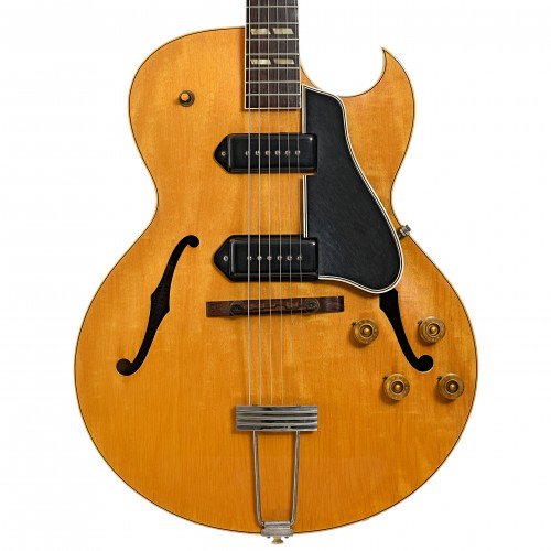 A sharp-looking vintage hollowbody, this 1954 Gibson ES-175D features a double-bound 16″ all-maple body with a natural finish, a mahogany neck, and a bound Brazilian rosewood fingerboard with split parallelogram inlays. Equipped with dual P-90 pickups for classic warm, articulate tones. Other details include a Brazilian rosewood adjustable bridge, Kluson tuners, and a headstock overlay with logo and crown inlays. later 50’s trapeze tailpiece installed, Includes the original hard shell case. Made in the USA. On consignment.