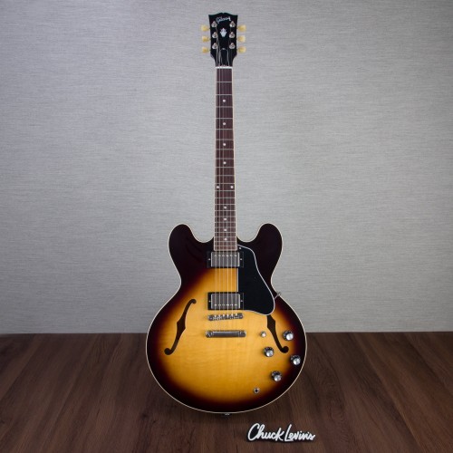 From its inaugural appearance in 1958, the Gibson ES-335 has remained an unmatched standard, prized for its versatility and rich tonal palette. Its laminated maple/poplar/maple body and solid maple centerblock help control feedback while retaining the airy resonance that has made the ES-335 beloved by players across genres—from warm jazz to articulate rock, and all sonic stops in between. A mahogany neck with a Rounded C profile provides a comfortable grip, whether you’re playing chords in the lower register or exploring melodic lines further up. The bound rosewood fretboard with acrylic Dot inlays offers a timeless aesthetic, while Vintage Deluxe tuners with Keystone buttons complete the classic headstock look. Paired with a lightweight aluminum ABR-1 Tune-O-Matic™ bridge and Stop Bar tailpiece, players can count on precise, stable tuning and accurate intonation for every performance. Calibrated T-Type humbuckers™ deliver a dynamic blend of vintage-inspired sweetness and modern definition, while hand-wired controls with Orange Drop® capacitors in the tone circuit ensure responsive, musical adjustments to volume and tone.