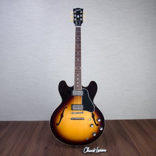 From its inaugural appearance in 1958, the Gibson ES-335 has remained an unmatched standard, prized for its versatility and rich tonal palette. Its laminated maple/poplar/maple body and solid maple centerblock help control feedback while retaining the airy resonance that has made the ES-335 beloved by players across genres—from warm jazz to articulate rock, and all sonic stops in between. A mahogany neck with a Rounded C profile provides a comfortable grip, whether you’re playing chords in the lower register or exploring melodic lines further up. The bound rosewood fretboard with acrylic Dot inlays offers a timeless aesthetic, while Vintage Deluxe tuners with Keystone buttons complete the classic headstock look. Paired with a lightweight aluminum ABR-1 Tune-O-Matic™ bridge and Stop Bar tailpiece, players can count on precise, stable tuning and accurate intonation for every performance. Calibrated T-Type humbuckers™ deliver a dynamic blend of vintage-inspired sweetness and modern definition, while hand-wired controls with Orange Drop® capacitors in the tone circuit ensure responsive, musical adjustments to volume and tone.