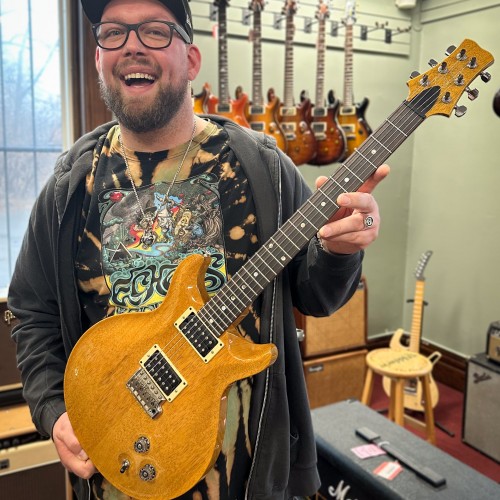Classic looks and rockin’ tone, dark TV yellow finish (“limed mahogany”) gives an “aged” look, mahogany body and neck, bound rosewood fretboard, dot inlays, 2 P-90 pickups, wrap-over bridge/tailpiece