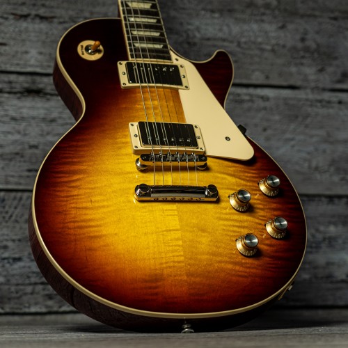 Timeless design and tone in this Gibson Les Paul Standard ’60s Figured Top. ’60s Burstbucker pickups add auditory appeal to a musically resonant mahogany body. With a SlimTaper neck, Plek’d rosewood fingerboard, and high-quality hardware, this solidbody electric guitar delivers unparalleled playability and reliability.