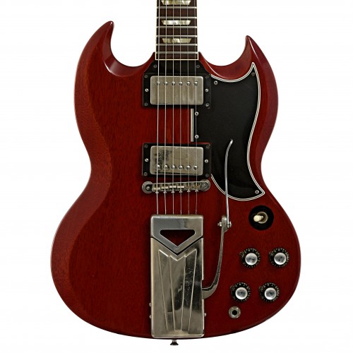 This 1962 Gibson Les Paul Standard (SG-style) is a well-preserved example of an early ’60s classic. It features a cherry-finished mahogany body and a wide-thin mahogany neck with a Brazilian rosewood fretboard and trapezoid inlays. Equipped with a pair of original PAF humbuckers (double black bobbins), an ABR-1 bridge, and a Sideways Vibrola tremolo. The pots date to the second week of 1962. Other details include Kluson tuners, a “Les Paul” truss rod cover, and headstock logo with crown inlay. Includes the original hard case. On consignment.