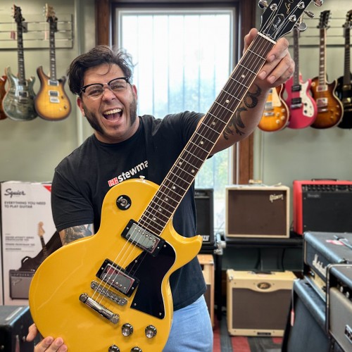 This super cool limited edition Les Paul Traditional Pro model features dual P90 pickups with tap-wire controls. A sleek, gloss black finish covers the maple top and mahogany body and neck. Features include a bound rosewood with trapezoid inlays, a Nashville TOM bridge, and Grover locking tuners. Original hard shell case. Made in USA.