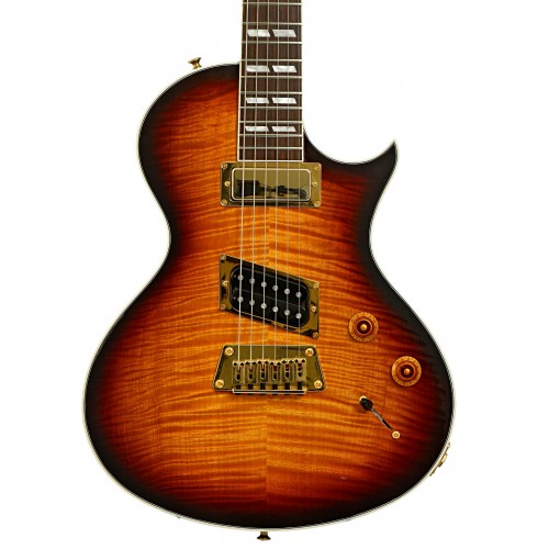 A smart-looking single cutaway solid body originally designed with Heart’s Nancy Wilson, features on this Nighthawk Fanatic include a pretty fireburst finish on bound maple top, and cherry finished mahogany body and neck. Appointments of split parallelogram inlays and gold hardware. Powered by a humbucking/mini-humbucking pickup configuration. Original hard shell case. Made in USA. On consignment.