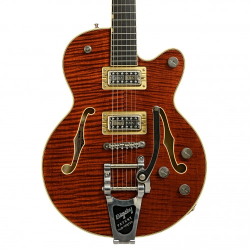 This Broadkaster Jr. is easy on the eyes, with a Bourbon Stain finish on a fancy flame maple body. A pair of Full’tron pickups brings the twang. It has a maple centerblock, and an ebony fingerboard on 2-piece mahogany neck. Equipped with an Adjusto-Matic bridge, and a Bigsby tailpiece. Original hard shell case. Import. On consignment.