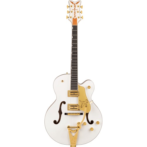 Boasting powerful sound and stage-ready tonal flexibility, this Falcon presents total sophistication — from the Midnight Sapphire or White gloss urethane finish to the gold Grover® Imperial™ locking tuning machines and gold jeweled G-arrow control knobs, to the gold sparkle bound neck, body and F-holes, to the striking pearloid Neo-Classic™ thumbnail inlays and gold vintage thick plexi pickguard with Gretsch and Falcon logos. A bold visual and sonic statement, the G6136TG Players Edition Falcon Hollow Body with String-Thru Bigsby and Gold Hardware updates the archetypical hollowbody electric guitar for modern players who demand distinction from themselves — and their tools.