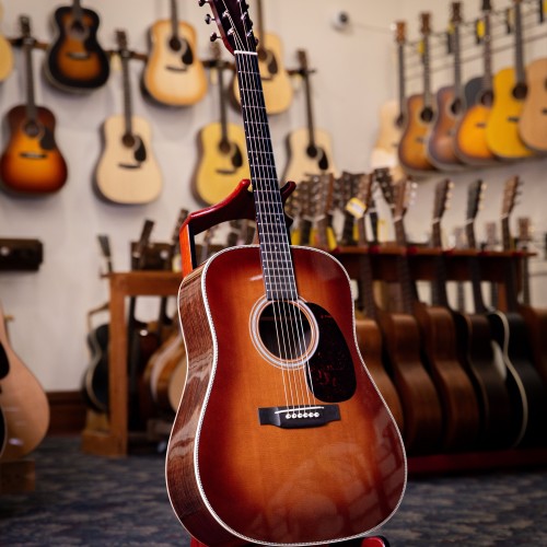 A big 70’s dreadnought that’s ready to pick, this D-50 features solid woods of an X-braced spruce top, rosewood back, sides and bridge, with an ebony fingerboard on a mahogany neck. Equipped with modern tuners, replacement bridge pins, L.R. Baggs pickup installed. Strong sound! Original hard shell case. Made in USA.