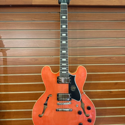 The Heritage Custom Core H-535 semi-hollow electric guitar is built in our factory at 225 Parsons Street, Kalamazoo, and features a laminated premium curly maple top and back. The guitar is finished in a vintage gloss nitrocellulose lacquer, that adds a subtle shine and ages beautifully over time.