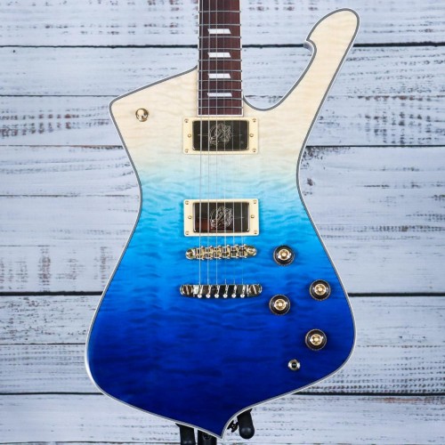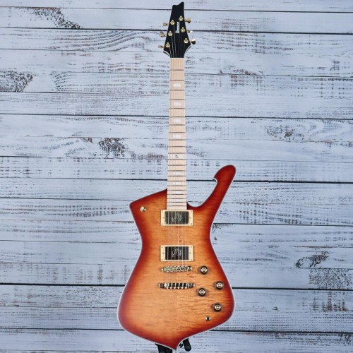 The Ibanez IC420FM Iceman delivers the iconic angular design that’s captivated players like Paul Stanley for decades. Built with a solid okoume body topped in striking flamed maple, this guitar combines visual impact with sonic substance. The 3-piece set-in okoume neck provides excellent sustain and resonance, while dual Super 80 humbuckers deliver a bright, PAF-inspired tone with aggressive output perfect for cutting through any mix.