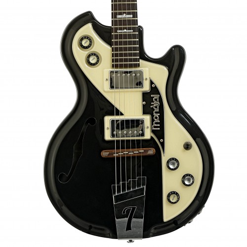 This groovy Mondial fiberglass semi-hollow is an Italian hipster in the making, with its Res-O-Glass top on a mahogany body with f-hole. It has a rosewood fingerboard with block and dot inlays. Equipped with dual humbucking pickups, and a bridge-mounted piezo pickups, for 2 independent pickup systems and outputs. Included are Gotoh tuners and a Trapeze tailpiece. Hard shell case. Import Model.