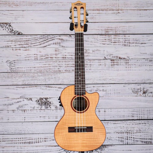 This 5-string electric tenor ukulele from Lanikai Flame Maple features a wider nut for comfort, along with select figured wood, open back tuners, wood marquetry, NuBone XB nut and saddle, and a Fishman Kula preamp with tuner. Additionally, this ukulele includes a satin finish, padded gig bag, and a Limited Lifetime Warranty. Popular among musicians, its bright crisp tone, comfortable playability, and attractive design give it an edge.
