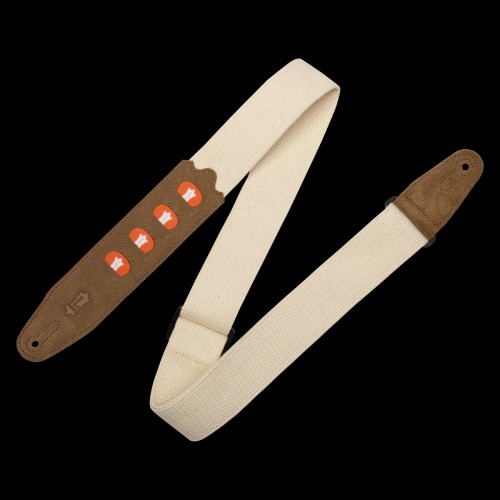 - Levy’s 2″ Signature Cotton Guitar Strap In Tan With Matching Suede Ends And Iconic Walnut Oval.